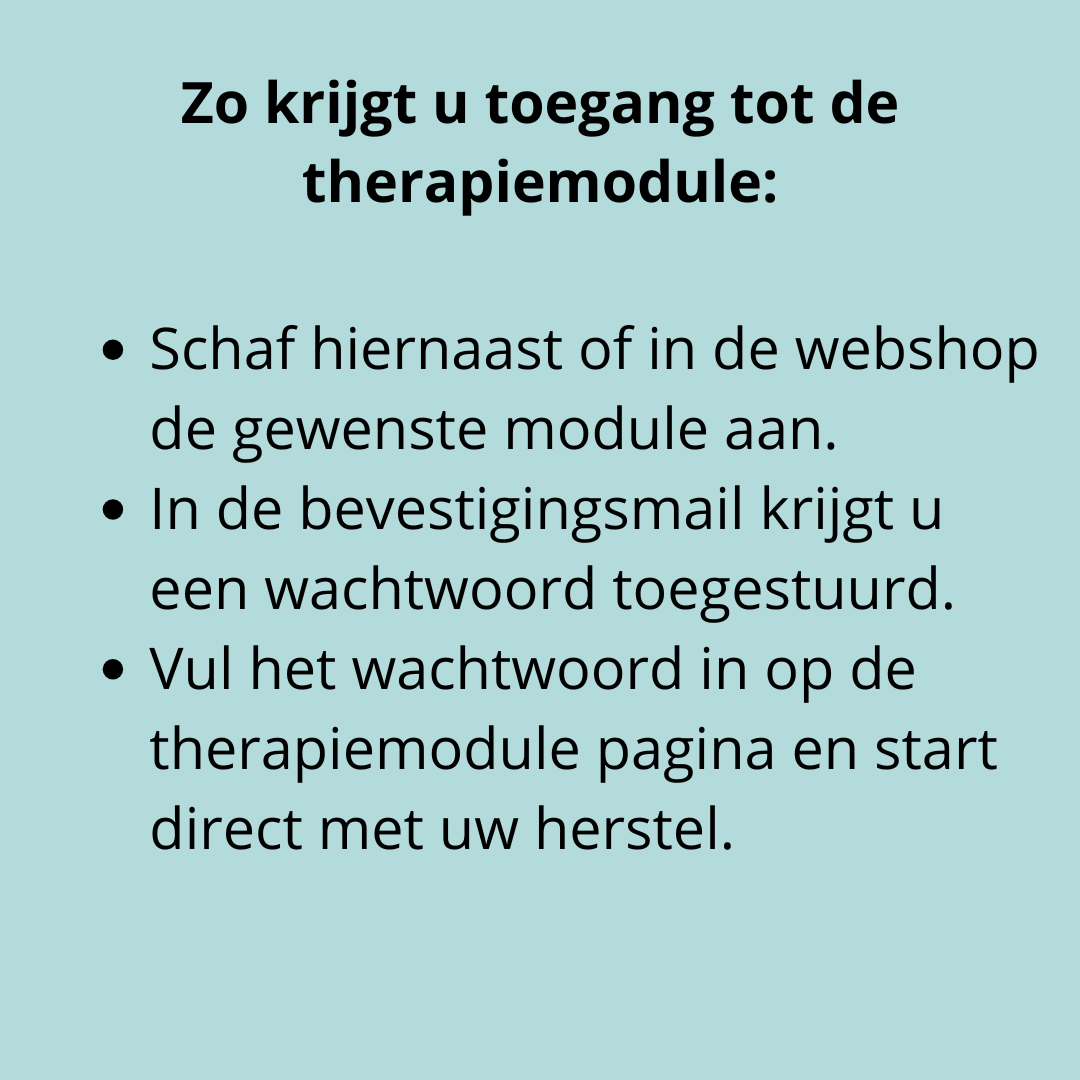 In de therapiemodule vindt u tips, adviezen en oefeningen om zelfstandig uw behandeling vorm te geven. Start vandaag nog met uw herstel!